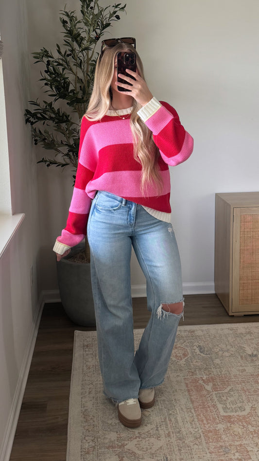 Sweetheart Striped Sweater / Red + Pink